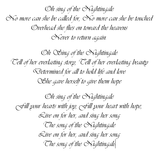 After the funeral, the Musictons of Crecklington, Nivara, had played together by her gravestone, and the colors of Nivara were returned. Straten had been put into a prison, along with Mrs. Bare. Rachel moved in with Master Brinalds until they could find a place of their own to stay in. Everie stood in the rain, not bothering to use an umbrella and stared at the words. She can’t really be gone, his mind thundered. Tears were flowing freely now. They had all sung the Nightingale’s Song at her funeral. A song that hadn’t been sung for hundreds of years. The song had been sung by a singer who gave her emotions to save her family. Now the song was sung for whoever gave their emotions up. The words left small holes where she should have been.